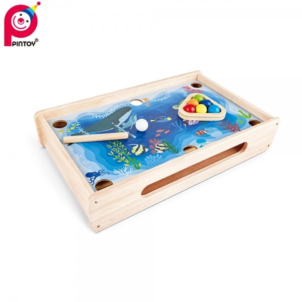 Ξύλινο επιτραπέζιο παιχνίδι δράσης 2 σε 1 από την εταιρεία Pin Toy. Το σετ περιλαμβάνει μικρό μπιλιάρδο και παιχνίδι pucket και βοηθάει τα παιδιά να αναπτύξουν ή να βελτιώσουν δεξιότητες όπως λεπτή κίνηση, συγκέντρωση, ισορροπία, συνεργασία και δημιουργικότητα. Είναι κατασκευασμένο από μασίφ ξύλο καουτσουκόδεντρου και οικολογικά χρώματα και λούστρα. Οι γωνίες δεν είναι αιχμηρές ώστε να μην υπάρχει κίνδυνος τραυματισμού. Η συσκευασία είναι κατασκευασμένη από ανακυκλώσιμα υλικά.