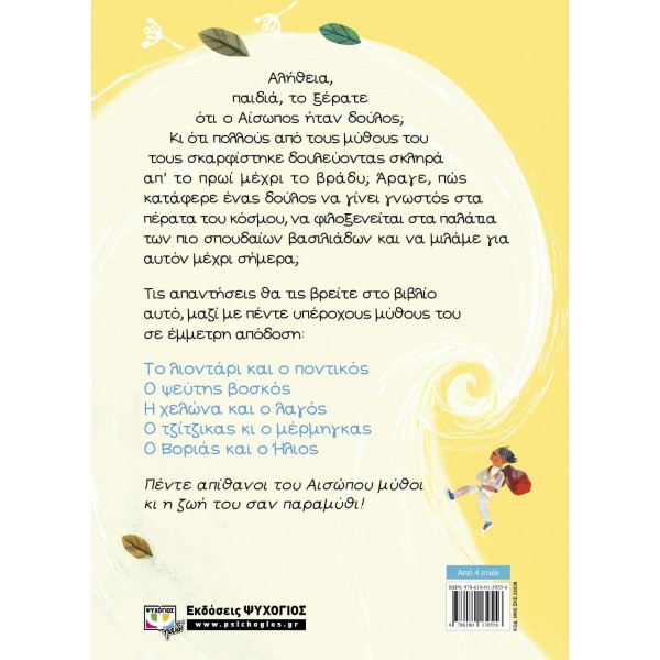 Αλήθεια, παιδιά, το ξέρατε ότι ο Αίσωπος ήταν δούλος; Κι ότι πολλούς από τους μύθους του τους σκαρφίστηκε δουλεύοντας σκληρά απ’ το πρωί μέχρι το βράδυ; Άραγε, πώς κατάφερε ένας δούλος να γίνει γνωστός στα πέρατα του κόσμου, να φιλοξενείται στα παλάτια των πιο σπουδαίων βασιλιάδων και να μιλάμε για αυτόν μέχρι σήμερα;