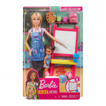 Το σετ περιλαμβάνει την κούκλα Barbie® Δασκάλα Ζωγραφικής και την αξιολάτρευτη μαθήτριά της! Οι δάσκαλοι ζωγραφικής μαθαίνουν στους μαθητές τους να εκφράζονται μέσα από την τέχνη και να εμπνέονται από τα πράγματα γύρω τους! Το καβαλέτο έχει ράφι και μία έκπληξη: χρησιμοποιήστε το πινέλο (βουτώντας το πρώτα σε νερό) και ζωγραφίστε πάνω στην λευκή επιφάνεια για να εμφανιστεί η ζωγραφιά! Η Barbie® Δασκάλα Ζωγραφικής μπορεί να μάθει στη μαθήτριά της να ζωγραφίζει και να εκφράζεται δημιουργικά! Σκουπίστε την επιφάνεια και δημιουργήστε ξανά και ξανά! Η Barbie φοράει κολάν, μπλουζάκι, αθλητικά παπούτσια και τζιν ποδιά, ενώ η μαθήτριά της φοράει ένα χαριτωμένο φόρεμα και έχει σακίδιο. Το σετ περιλαμβάνει: ένα καβαλέτο με επιφάνεια ζωγραφικής, "δοχεία" μπογιάς και νερού, παλέτα, πινέλο και σκαμπό για τη μαθήτρια. Τα παιδιά θα εκφραστούν δημιουργικά και θα εμπνευστούν πολλές ιστορίες!