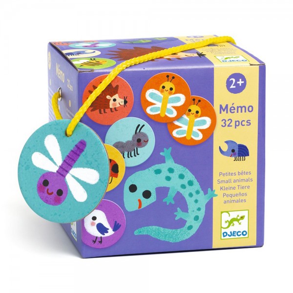 Memo Small Animals. Επιτραπέζιο παιχνίδι μνήμης της εταιρείας Djeco. Πριν ξεκινήσει το παιχνίδι, ανακατεύουμε και τοποθετούμε ανάποδα όλες τις κάρτες. Κάθε φορά που έρχεται η σειρά ενός παίκτη θα πρέπει να αναποδογυρίσει δύο στρογγυλές κάρτες: εάν απεικονίζουν το ίδιο ζωάκι, τότε κερδίζει τις κάρτες, αλλιώς περιμένει τον επόμενο γύρο για να ξαναπροσπαθήσει! Ένα εκπαιδευτικό παιχνίδι που αναπτύσσει τη συγκέντρωση, την υπομονή, τη παρατηρητικότητα και τη μνήμη των παιδιών. Τα παιδιά μαθαίνουν να ακολουθούν κανόνες, να αλληλοεπιδρούν με τους άλλους παίκτες και να κοινωνικοποιούνται. Το παιχνίδι περιλαμβάνει 32 στρογγυλές κάρτες (διάμετρος 7,8 εκατοστά) από ανθεκτικό σκληρό πεπιεσμένο χαρτόνι, μέσα σε μία βολική συσκευασία σε σχήμα κύβου με κορδονάκι, ώστε να μεταφέρεται εύκολα.
