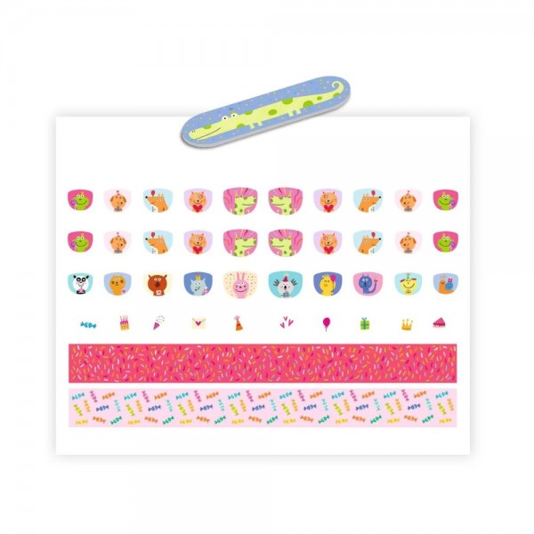 Αυτοκόλλητα νυχιών της εταιρείας Djeco, σχεδιασμένα για να προσφέρουν το πιο εύκολο και γρήγορο μανικιούρ! Έχουν διάρκεια, είναι ανθεκτικά στο νερό και τοποθετούνται και αφαιρούνται εύκολα με μία κίνηση: απλά πιέστε το αυτοκόλλητο στο σωστό μέγεθος νυχιού και είστε έτοιμοι! Εάν κάποιο αυτοκόλλητο περισσεύει από το νύχι, μπορείτε εύκολα να το ισιώσετε με την παιδική λίμα που περιλαμβάνεται. Επιπλέον, τα παιδιά έχουν τη δυνατότητα να δημιουργήσουν τα δικά τους μοναδικά αυτοκόλλητα, κόβοντας κομμάτια από την αυτοκόλλητη ταινία, δίνοντας της το σχήμα που θέλουν! Μια ευχάριστη ενασχόληση με την οποία τα παιδιά αναπτύσσουν την δημιουργικότητα τους και ανακαλύπτουν το προσωπικό τους στύλ. Το σετ περιλαμβάνει 120 αυτοκόλλητα νυχιών σε διαφορετικά μεγέθη και σχέδια και 2 λίμες.