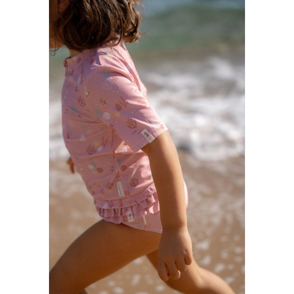 Αυτό το κοντομάνικο μπλουζάκι είναι ιδανικό για ηλιόλουστες μέρες στην παραλία. Με ένα παιχνιδιάρικο θέμα, διαθέτει ανοιχτό ροζ χρώμα με ιππόκαμπους, κοράλλια και κοχύλια για μια μαγευτική εμφάνιση. Το φερμουάρ μπροστά διευκολύνει το ντύσιμο ακόμα και όταν το μικρό σας είναι βρεγμένο, ενώ τα βολάν στο τελείωμα προσθέτουν μια ρομαντική λεπτομέρεια.