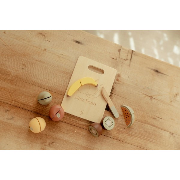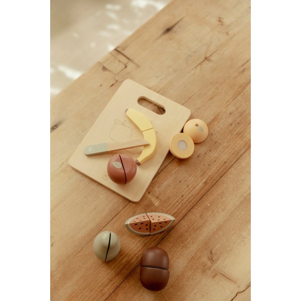 - Περιέχει 8 τεμάχια: ξύλο κοπής, ξύλινο μαχαίρι, μήλο, μπανάνα, ακτινίδιο, αχλάδι, πορτοκάλι και μία φέτα καρπούζι.