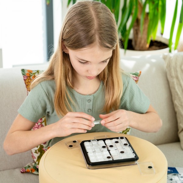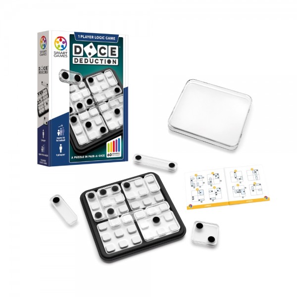 Η εταιρεία Smart Games παρουσιάζει το Dice Deduction, ένα παιχνίδι στρατηγικής σκέψης και αριθμητικής λογικής που θα σας βάλει για τα καλά σε… κατάσταση ζαριάς! Στόχος του παιχνιδιού είναι να τοποθετήσετε τα διάφανα κομμάτια στο ταμπλό έτσι ώστε οι μαύρες κουκίδες να ευθυγραμμίζονται με τις πλευρές των ζαριών που εμφανίζονται στην εκάστοτε πρόκληση — και τα αθροίσματα να ταιριάζουν με τα βέλη! Με 60 προκλήσεις κλιμακούμενης δυσκολίας, το παιχνίδι συνδυάζει μαθηματική σκέψη και στρατηγικό σχεδιασμό, αναπτύσσοντας δεξιότητες όπως λογική, αντίληψη χώρου, προγραμματισμό κινήσεων και συγκέντρωση. Κάθε πρόκληση έχει μία μοναδική λύση, που μπορείτε να ανακαλύψετε στο τέλος τους εγχειριδίου που περιλαμβάνεται στη συσκευασία. Περιεχόμενα: Ταμπλό παιχνιδιού με 4 πλευρές ζαριών, 12 διάφανα κομμάτια (8 με μαύρες κουκίδες και 4 κενά), βιβλιαράκι με 60 προκλήσεις και λύσεις. Ένα έξυπνο, αριθμητικό παιχνίδι για έναν παίκτη από 10 ετών και άνω — εκεί όπου η τύχη συναντά τη λογική!