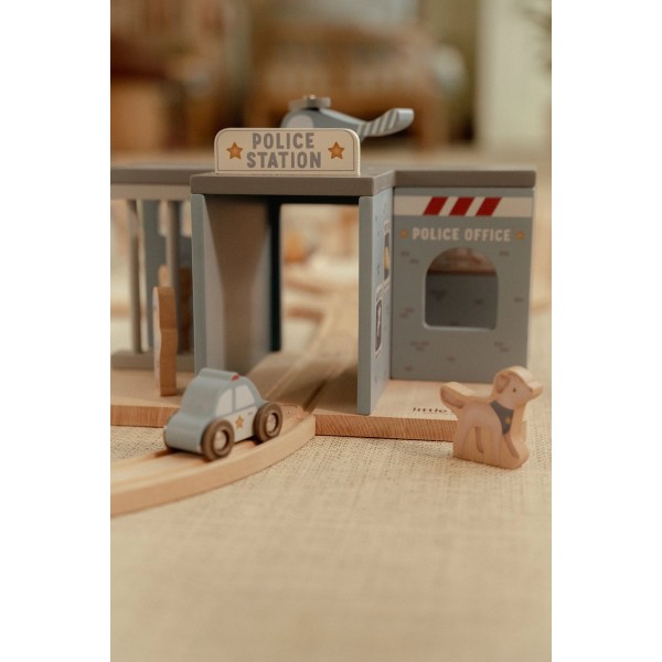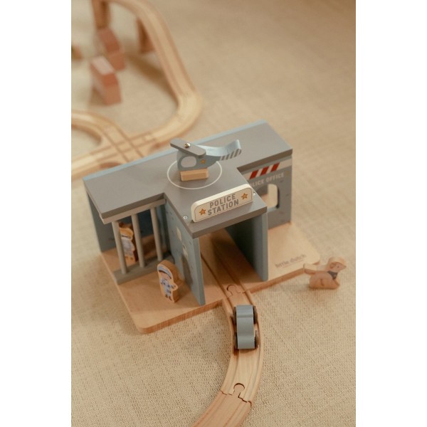 Αυτό το ξύλινο αστυνομικό τμήμα είναι πλήρως εξοπλισμένο για συναρπαστικές περιπέτειες, με περιπολικό, ελικόπτερο, γενναίο αστυνομικό, πονηρό κλέφτη και έναν πιστό αστυνομικό σκύλο. Ο σταθμός διαθέτει κελί με κάγκελα και ελικοδρόμιο στην ταράτσα.