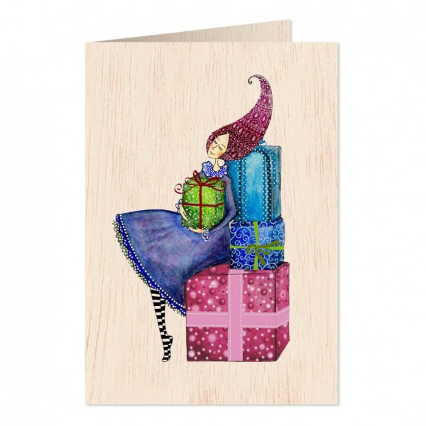 Ξύλινη ευχετήρια κάρτα από την εταιρεία Cozywood. Η κάρτα είναι κατασκευασμένη από επεξεργασμένο ξύλο και ο φάκελος που περιέχεται είναι χάρτινος.