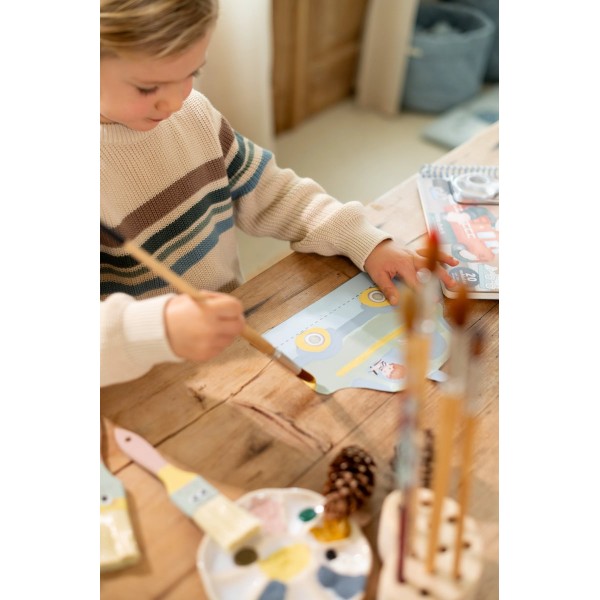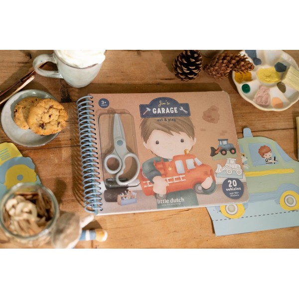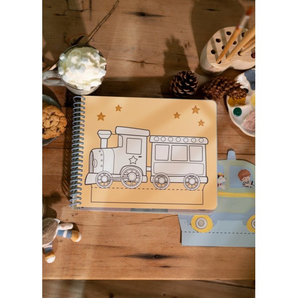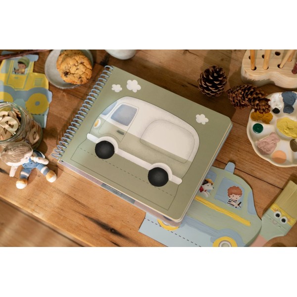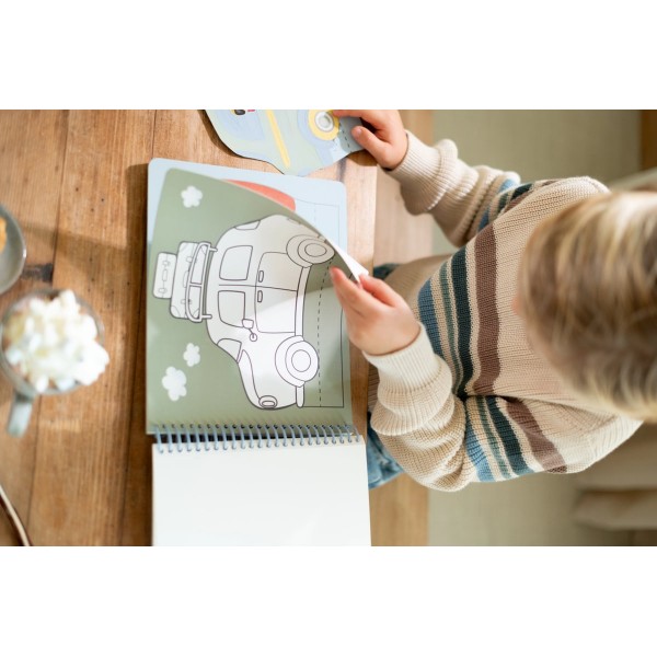 Περιλαμβάνει 20 προτυπωμένες σελίδες με διάφορα σχέδια οχημάτων, ένα ψαλίδι και αυτοκόλλητα για εξατομικευμένη διακόσμηση