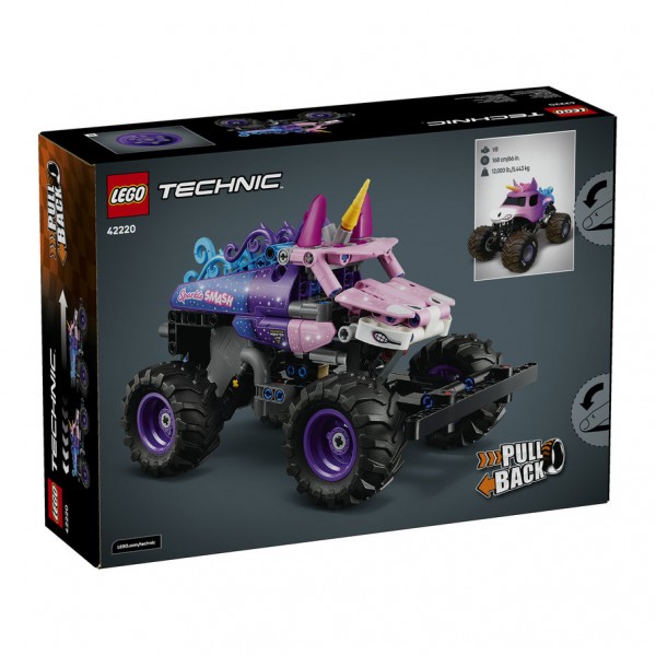 LEGO Technic Monster Jam Sparkle Smash. Δώστε το έναυσμα για επικό παιχνίδι με αυτό το απίθανο, pull-back φορτηγό Monster Jam™ για αγόρια και κορίτσια ηλικίας 7 ετών και άνω. Χρησιμοποιήστε τη λειτουργία pull-back για να εξαπολύσετε το LEGO Technic Monster Jam Sparkle Smash (42220) στη δράση. Ετοιμαστείτε για επικό παιχνίδι καθώς οι νεαροί φαν των monster trucks αναδημιουργούν τα αγαπημένα τους κόλπα και ακροβατικά από την αρένα Monster Jam. Αυτό το σετ κατασκευής είναι διασκεδαστικό δώρο για νεαρούς κατασκευαστές που αγαπούν τα LEGO οχήματα και το Monster Jam. Αυτό το λεπτομερές παιχνίδι μονόκερος φορτηγό τέρας έρχεται με αυθεντικές σχεδιαστικές λεπτομέρειες, όπως τα αστραφτερά αστέρια και το εμβληματικό κέρατο μονόκερου, εμπνευσμένο από το πραγματικό φορτηγό Sparkle Smash. Τα σετ LEGO Technic διαθέτουν ρεαλιστικές κινήσεις και μηχανισμούς που φέρνουν σε επαφή τους μικρούς LEGO κατασκευαστές με τον κόσμο της μηχανικής με προσιτό και ρεαλιστικό τρόπο. Τα παιδιά μπορούν να κατασκευάζουν με αυτοπεποίθηση χρησιμοποιώντας την εφαρμογή LEGO Builder που τους επιτρέπει να ζουμάρουν και περιστρέφουν σε 3D και παρακολουθούν την πρόοδο με απλές ψηφιακές οδηγίες.