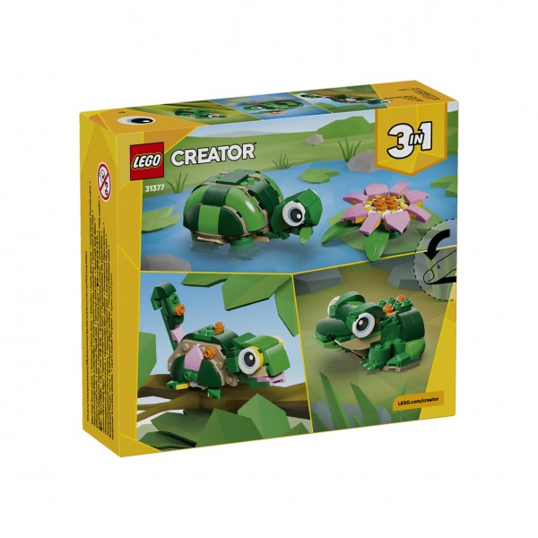 LEGO Creator 3in1 Turtle With A Water Lily Flower. Με το σετ κατασκευής LEGO Creator 3in1 Turtle With A Water Lily Flower (31377), τα παιδιά ηλικίας 7 ετών και άνω αναπαριστούν δημιουργικές ιστορίες με ζώα. Αυτό το χαριτωμένο παιχνίδι με ζώα για κορίτσια και αγόρια προσφέρει 3 διαφορετικές επιλογές κατασκευής με τα ίδια τουβλάκια. Τα παιδιά μπορούν να επιλέξουν να κατασκευάσουν μια χελώνα με αρθρωτό κεφάλι και στόμα, που συνοδεύεται από ένα όμορφο ροζ νούφαρο. Στη συνέχεια, μπορούν να την ανακατασκευάσουν σε χαμαιλέοντα με αρθρωτό κεφάλι και ουρά ή σε βάτραχο με κινούμενο στόμα. Όταν το παιχνίδι τελειώσει, κάθε μοντέλο γίνεται ένα διασκεδαστικό διακοσμητικό δωματίου. Αυτό το LEGO Creator 3 σε 1 σετ θα εμπνεύσει τη φαντασία των παιδιών και είναι χαριτωμένο δώρο μεγάλης αξίας για κορίτσια και αγόρια που αγαπούν το παιχνίδι μίμησης και τα άγρια ζώα. Και με την εφαρμογή LEGO Builder, τα παιδιά θα απολαύσουν μια εύκολη και απλή περιπέτεια κατασκευής. Μπορούν να ζουμάρουν και να περιστρέφουν τα σετ τους χρησιμοποιώντας 3D οδηγίες κατασκευής, να παρακολουθούν την πρόοδό τους και να τα αποθηκεύουν σε ένα μέρος. Σημειώστε ότι η ταυτόχρονη κατασκευή των μοντέλων δεν είναι δυνατή.