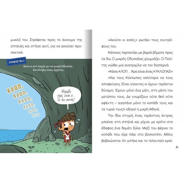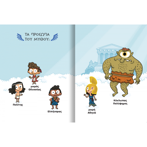 Από μυστηριώδεις σπηλιές μέχρι ριψοκίνδυνα σχέδια για να τυφλώσουν τον Κύκλωπα, οι μικροί ήρωες ζουν μια συναρπαστική περιπέτεια γεμάτη γέλιο, αγωνία και ανακαλύψεις. Μέσα από ζωντανές εικόνες και διαδραστικούς γρίφους, τα παιδιά ανακαλύπτουν τους μικρούς ήρωες της ελληνικής μυθολογίας, μαθαίνουν να παρατηρούν, να σκέφτονται στρατηγικά και να λύνουν μυστήρια, ενώ διασκεδάζουν με τις πονηριές και τα έξυπνα σχέδια του μικρού Οδυσσέα.