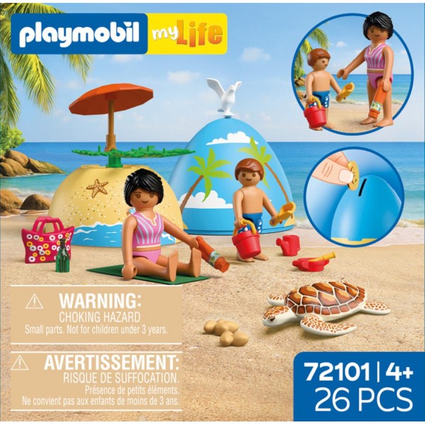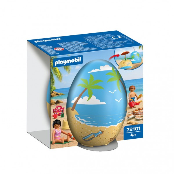 Τα νέα αυγά PLAYMOBIL προσφέρουν ακόμα μεγαλύτερη διασκέδαση! Κάθε χρωματιστό αυγό κρύβει πολλές εκπλήξεις: Δύο φιγούρες, πολλά αξεσουάρ και ένα μικρό σκηνικό παιχνιδιού που μπορεί να συναρμολογηθεί αμέσως χρησιμοποιώντας τα δύο μέρη του. Πάμε θάλασσα: Στην παραλία, μητέρα και γιος απολαμβάνουν τον ήλιο και ατελείωτο παιχνίδι με τα κουβαδάκια. Στους αμμόλοφους ανακαλύπτουν μια μαμά χελώνα με τα αυγουλάκια της. Το αυγό μπορεί να χρησιμοποιηθεί και ως κουμπαράς.