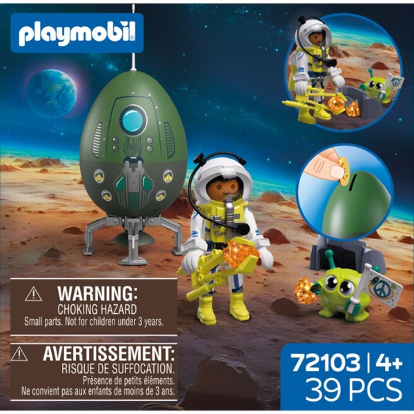 Τα νέα αυγά PLAYMOBIL προσφέρουν ακόμα μεγαλύτερη διασκέδαση! Κάθε χρωματιστό αυγό κρύβει πολλές εκπλήξεις: Δύο φιγούρες, πολλά αξεσουάρ και ένα μικρό σκηνικό παιχνιδιού που μπορεί να συναρμολογηθεί αμέσως χρησιμοποιώντας τα δύο μέρη του. Περιπέτεια στο διάστημα: Σε έναν μακρινό πλανήτη, ο εξερευνητής συναντάει έναν φιλικό εξωγήινο που κράταει μια λευκή σημαία ειρήνης. Μαζί, θαυμάζουν τον σπάνιο, λαμπερό κρύσταλλο – και ο εξωγήινος του τον δωρίζει χωρίς δεύτερη σκέψη. Το αυγό μπορεί να χρησιμοποιηθεί και ως κουμπαράς.
