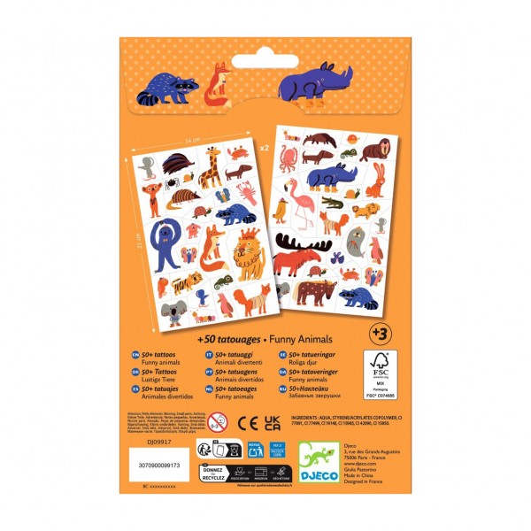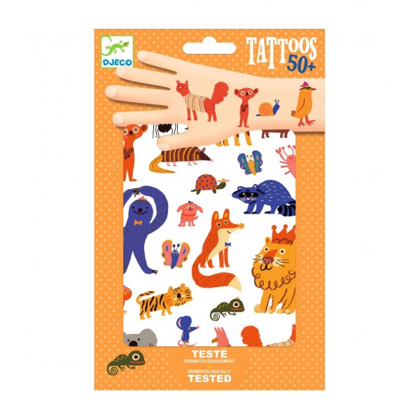 Τα τατουάζ της εταιρείας Djeco θα ενθουσιάσουν τους μικρούς μας φίλους! Είναι δερματολογικά ελεγμένα και η εφαρμογή τους είναι πολύ εύκολη, απλά πιέζετε το σχέδιο της επιλογής σας στο δέρμα χρησιμοποιώντας νερό. Κατάλληλο για ηλικίες από 3 ετών και άνω. Περιέχονται δύο κάρτες με 50 διαφορετικά σχέδια.