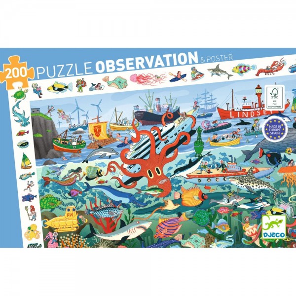Ένα εντυπωσιακό παζλ 200 κομματιών από την εταιρεία Djeco, που ταξιδεύει τα παιδιά στον μαγικό κόσμο του βυθού μέσα από πλούσια, γεμάτη λεπτομέρειες εικονογράφηση. Αφού ολοκληρωθεί το παζλ, το παιχνίδι συνεχίζεται: τα παιδιά καλούνται να εντοπίσουν μέσα στην εικόνα τα στοιχεία που εμφανίζονται στο περίγραμμα, μετατρέποντας το παζλ σε ένα διασκεδαστικό παιχνίδι παρατήρησης. Η διαδικασία αυτή ενισχύει τη παρατηρητικότητα και κρατά το ενδιαφέρον αμείωτο για περισσότερη ώρα. Η συναρμολόγηση των κομματιών βοηθά στην ανάπτυξη της λογικής σκέψης και της επίλυσης προβλημάτων, ενώ παράλληλα καλλιεργεί τη συγκέντρωση και την υπομονή. Το παιδί εξασκεί επίσης τη χωρική αντίληψη, μαθαίνοντας να αντιλαμβάνεται πώς τα κομμάτια συνδέονται μεταξύ τους για να δημιουργήσουν μια ολοκληρωμένη εικόνα. Το παζλ συνοδεύεται από αφίσα στο φυσικό του μέγεθος, που λειτουργεί ως βοήθημα, ενώ η υψηλή ποιότητα κατασκευής επιτρέπει την επαναλαμβανόμενη χρήση χωρίς φθορές. Ένα παιχνίδι ιδανικό τόσο για αυτόνομο όσο και για συνεργατικό παιχνίδι. Περιεχόμενα: Παζλ 200 κομματιών (61 x 38 cm) Αφίσα αναφοράς Κατασκευασμένο στην Ευρώπη από χαρτί και χαρτόνι με πιστοποίηση FSC®.