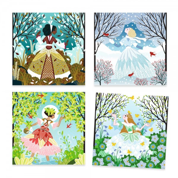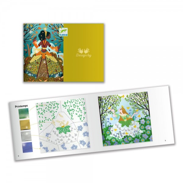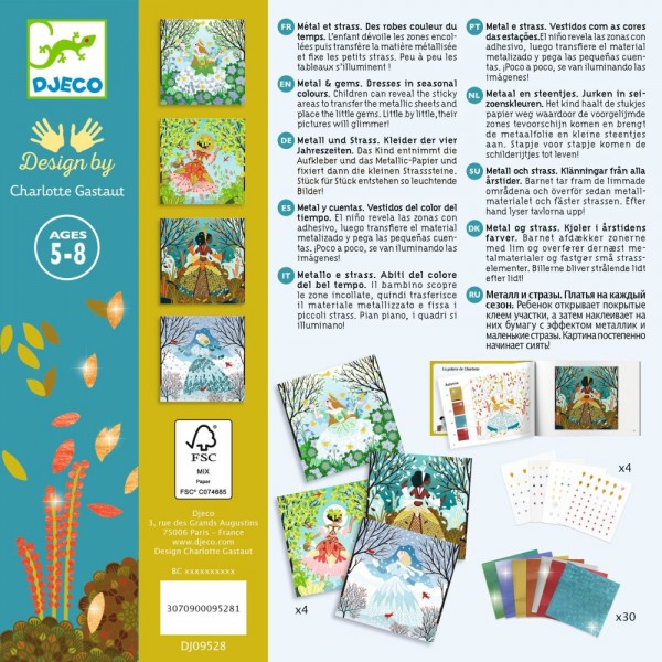 Ένα εντυπωσιακό καλλιτεχνικό σετ από την εταιρεία Djeco, που δίνει στα παιδιά τη δυνατότητα να διακοσμήσουν φορέματα με λαμπερές μεταλλικές λεπτομέρειες και στρας, δημιουργώντας μοναδικές εικόνες εμπνευσμένες από τις εποχές. Τα παιδιά ακολουθούν τον χρωματικό κώδικα, αποκαλύπτουν τις κολλητικές επιφάνειες με το ειδικό εργαλείο και τοποθετούν τα μεταλλικά φύλλα, τα οποία «κολλούν» μαγικά πάνω στην εικόνα. Στη συνέχεια προσθέτουν στρας για ένα ακόμη πιο εντυπωσιακό αποτέλεσμα. Η διαδικασία αυτή ενισχύει τη συγκέντρωση και τη λογική σκέψη, καθώς το παιδί καλείται να ακολουθήσει σωστά τα βήματα. Η προσεκτική τοποθέτηση των υλικών βοηθά στην ανάπτυξη της λεπτής κινητικότητας και του συντονισμού ματιού-χεριού, ενώ η επιλογή χρωμάτων και η τελική αισθητική του έργου καλλιεργεί τη δημιουργικότητα και την αισθητική νοημοσύνη. Παράλληλα, η παρατήρηση των λεπτομερειών ενισχύει τη παρατηρητικότητα. Ένα δημιουργικό σετ που προσφέρει στιγμές χαλάρωσης και αυτόνομης απασχόλησης, μετατρέποντας κάθε εικόνα σε μικρό έργο τέχνης. Περιεχόμενα: 4 εικονογραφημένες κάρτες (20 x 20 εκ.) με προεπεξεργασμένη επιφάνεια, μεταλλικά φύλλα σε διάφορα χρώματα, αυτοκόλλητα στρας και 1 εικονογραφημένο βιβλιαράκι οδηγιών. Κατασκευασμένο από χαρτί και χαρτόνι με πιστοποίηση FSC®.