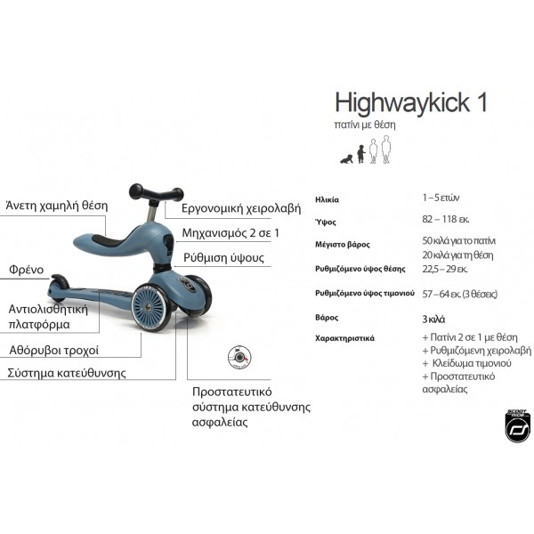 Το Highwaykick 1 είναι ο ιδανικός φίλος για παιδιά από 1 έως 5 ετών. Το Highwaykick 1 είναι το πρώτο πατίνι 2 σε 1, παγκοσμίως, το οποίο μπορεί να μετατραπεί από πατίνι σε ποδήλατο ισορροπίας χωρίς τη χρήση επιπρόσθετων εργαλείων! Χάρη στη σταθερότητα που εξασφαλίζουν οι 2 μπροστινοί και ένας πισινός τροχός του, το προϊόν επιτρέπει ακόμα και στα πιο μικρά παιδιά να μετακινούνται, καθισμένα με ασφάλεια και άνεση.