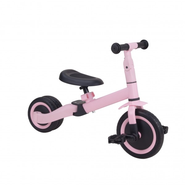 Mπορεί εύκολα να μετατραπεί από τρίκυκλο σε ποδήλατο ισορροπίας αναδιπλώνοντας και τους δύο πίσω τροχούς προς τα μέσα. Αυτό διευκολύνει τη μετάβαση σε ποδήλατο με πεντάλ. Τα πεντάλ συναρμολογούνται εύκολα και μπορούν να αφαιρεθούν και να αποθηκευτούν με ασφάλεια στο πλαίσιο κάτω από τη σέλα. Το τιμόνι και η σέλα είναι και τα δύο ρυθμιζόμενα και προσαρμόζονται στις ανάγκες του παιδιού.