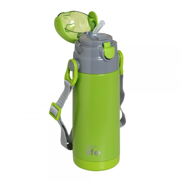 Ανοξείδωτο παιδικό παγούρι θερμός 400ml της Ecolife! Με διπλά τοιχώματα για διατήρηση της θερμοκρασίας για πολλές ώρες! Με εσωτερικό, μαλακό καλαμάκι από σιλικόνη και ευκολία στη χρήση με κλείσιμο με ένα "κλικ". Με ιμάντα μεταφοράς για να φοριέται "χιαστί". Κατασκευασμένο από ανοξείδωτο ατσάλι 304 (18/8 stainless steel). Xωρίς δισφαινόλη & καρκινογόνες ουσίες (ΒPA free). 100% υγιεινή επιλογή για μωρά & μικρά παιδιά.
