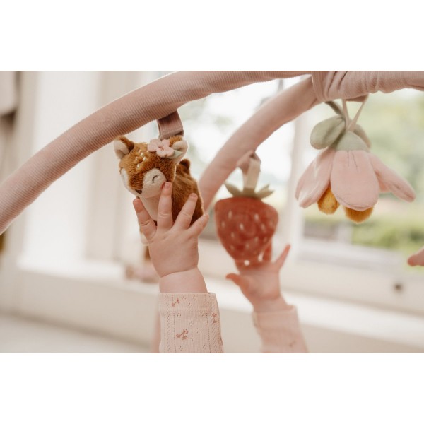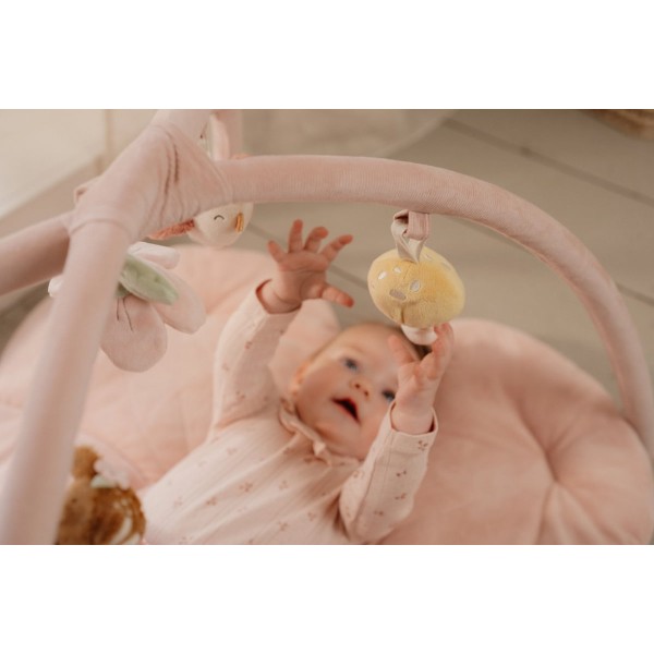 Κάθε μέρα γίνεται μια περιπέτεια με αυτό το μαγικό γυμναστήριο δραστηριοτήτων σε σχήμα λουλουδιού. Σε απαλό ροζ χρώμα, διαθέτει δύο άνετους βελούδινους θόλους με πέντε χαριτωμένα κρεμαστά παιχνίδια από τη συλλογή Fairy Garden.
