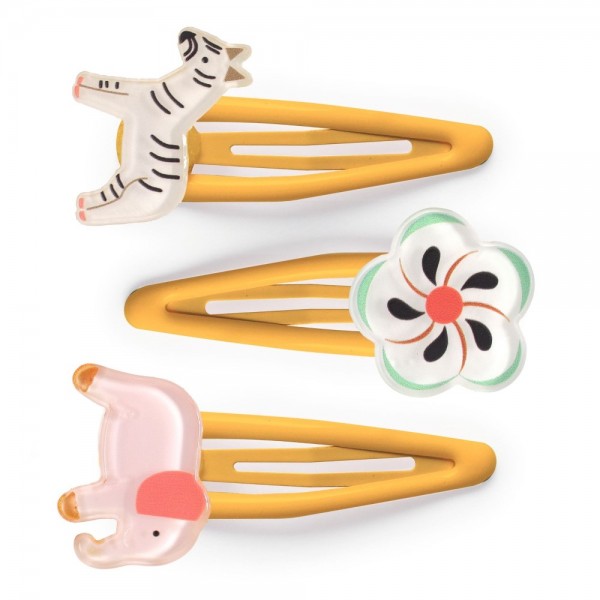 Σετ τριών παιδικών κλιπ μαλλιών από την εταιρεία Djeco, ιδανικό για κάθε παιδικό κεφαλάκι. Μια ζέβρα, ένα λουλούδι και ένα ελεφαντάκι δίνουν σε κάθε μεταλλικό κλιπ τον δικό του ξεχωριστό χαρακτήρα. Εξασφαλίζουν σταθερό κράτημα και άνεση προσθέτοντας φαντασία και στυλ σε κάθε παιδικό λουκ.
