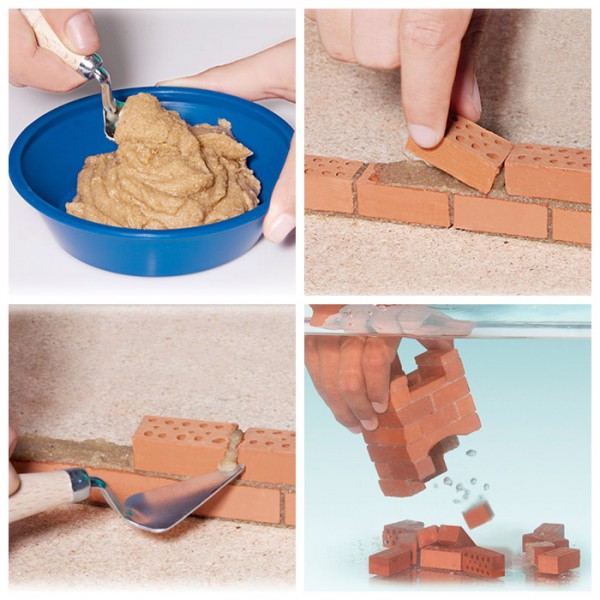 Σετ κατασκευής, για μικρούς και μεγάλους αρχιτέκτονες και κατασκευαστές! Το υλικό που χρησιμοποιείται είναι πραγματικό κεραμικό τουβλάκι και ειδική υδροδιαλυτή κόλλα τσιμέντου. Επίσης περιλαμβάνονται το μίνι μυστρί και το βοηθητικό μπολ για ν αναμείξουμε τα υλικά μας. Απλά διαλύστε το τσιμέντο στο νερό και ξεκινήστε το χτίσιμο! Αν θέλετε να δημιουργήσετε κάποια καινούρια κατασκευή ή να τροποποιήσετε την ήδη υπάρχουσα απλά ρίξτε την στο νερό. Μ αυτό τον τρόπο διαλύεται η υδροδιαλυτή κόλλα. Κάθε φορά μπορούμε να ανανεώνουμε την κόλλα μας ή να προσθέτουμε κι άλλα τουβλάκια για να επεκτείνουμε την κατασκευή μας. Μοναδικό σύστημα κατασκευής από την εταιρεία Teifoc. Η συσκευασία περιέχει 150 τουβλάκια και οδηγίες κατασκευής για τρία διαφορετικά σχέδια!