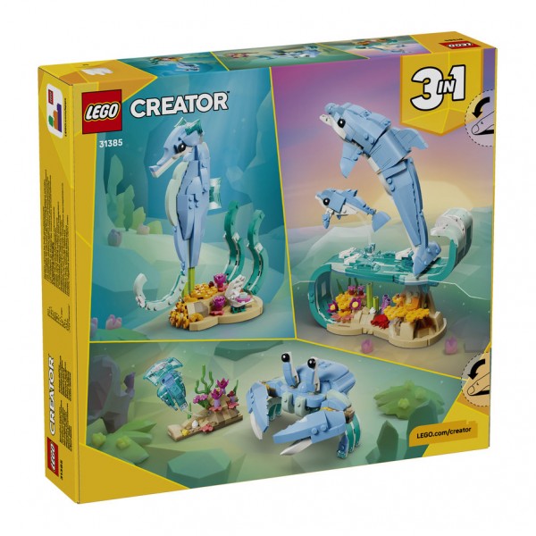LEGO Creator 3in1 Sea Animals: Beautiful Dolphins. Το LEGO Creator 3in1 Sea Animals: Beautiful Dolphins (31385) δίνει στα παιδιά ηλικίας 9 ετών και άνω την ευκαιρία να αναπαραστήσουν διασκεδαστικές ιστορίες. Αυτό το σετ παιχνιδιού με φιγούρες θαλάσσιων ζώων για κορίτσια και αγόρια προσφέρει 3 διαφορετικές επιλογές κατασκευής με τα ίδια τουβλάκια. Μπορούν να επιλέξουν να κατασκευάσουν το δυναμικό μοντέλο ενός ενήλικου και ενός μωρού δελφινιού με αρθρωτά χαρακτηριστικά που καβαλούν ένα κύμα πάνω από κοράλλια. Μετά μπορούν να το ανακατασκευάσουν σε αρθρωτό ιππόκαμπο πάνω σε μια πολύχρωμη βάση με φύκια και αρθρωτή αχιβάδα ή σε καβούρι δίπλα σε θαλάσσια φυτά και μια μέδουσα. Όταν το παιχνίδι τελειώσει, κάθε όμορφο μοντέλο γίνεται ένα υπέροχο διακοσμητικό με θέμα τη φύση, για το ράφι ή το γραφείο. Αυτό το LEGO Creator 3 σε 1 σετ θα εμπνεύσει τη φαντασία των παιδιών και είναι εξαιρετική ιδέα δώρου για παιδιά που αγαπούν τα θαλάσσια ζώα. Μπορούν να κατασκευάσουν κάθε σετ παιχνιδιού με αυτοπεποίθηση χρησιμοποιώντας την εφαρμογή LEGO Builder – ζουμάρουν και περιστρέφουν σε 3D και παρακολουθούν την πρόοδο με απλές ψηφιακές οδηγίες. Σημειώστε ότι η ταυτόχρονη κατασκευή των μοντέλων δεν είναι δυνατή.