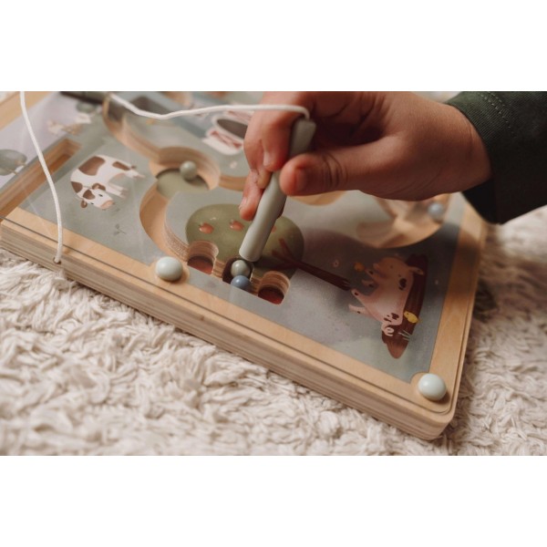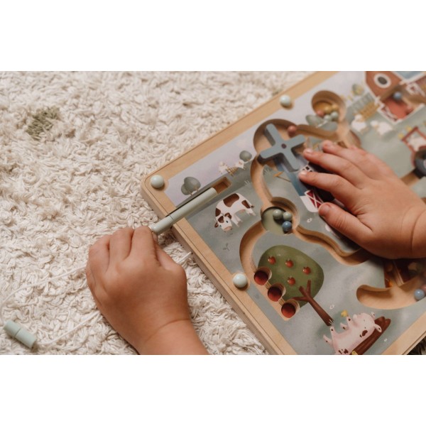 Μαγνητικό ξύλινος λαβύρινθος Little Farm από την εταιρεία Little Dutch. Θα έρθεις μαζί μας σε μια περιπέτεια στη φάρμα; Πιάσε μία ή περισσότερες μπάλες με το μαγνητικό στυλό και μετακίνησέ τες σε ένα σημείο της επιλογής σου. Για παράδειγμα, μπορείς να μετακινήσεις όλες τις μπλε μπάλες στη λίμνη και δύο κόκκινες μπάλες στη μηλιά. Στη διαδρομή, μπορεί να συναντήσεις εμπόδια, όπως τον περιστρεφόμενο τροχό του τρακτέρ και τα πανιά του ανεμόμυλου. Πού θα επιλέξεις να μεταφέρεις τις μπάλες τελικά;