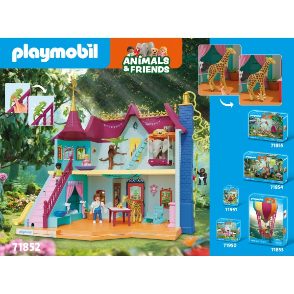 Καλώς ήρθατε στον πολύχρωμο κόσμο των Ζώων & Φίλων – όπου το θαύμα είναι μέρος της καθημερινότητας και η φαντασία δεν έχει όρια! Η ζωντανή και χαρούμενη βίλα είναι η καρδιά της ζωής για τη λάτρη των ζώων, των δύο παιδιών της και των αγαπημένων τους ζώων. Εδώ, όλοι διασκεδάζουν πολύ και μπορούν πάντα να στηρίζονται ο ένας στον άλλο. Το μικρό ελεφαντάκι βοηθά ενθουσιωδώς με το στρώσιμο του τραπεζιού, ενώ το μωρό καμηλοπάρδαλη κλέβει γλυκά γύρω από το σπίτι. Τα ρακούν κάνουν σκανταλιές στη σοφίτα, τα μικρά τσιτάχ αγαπούν να κουνιούνται, και το μικρό πιθηκάκι απολαμβάνει την αναρρίχηση και την ξεκούραση στο δέντρο που έχει φτάνει από τη βεράντα μέσα στο σπίτι. Ψάχνετε την μικρή πάπια; Απολαμβάνει το μπάνιο της στην εσωτερική λίμνη, ενώ οι μαϊμούδες έχουν βρει τη αγαπημένη τους γωνιά σε μια μυστική κρυψώνα μπροστά, κάτω από την εντυπωσιακή σκάλα. Ωστόσο, το πιο περιζήτητο μέρος στο σπίτι είναι η ζεστή σπηλιά με το κρεβάτι στο πίσω μέρος, κάτω από τη σκάλα.