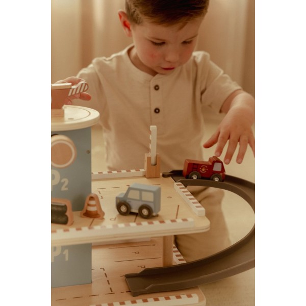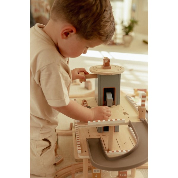 Αυτό το ξύλινο γκαράζ χαρίζει ασταμάτητη δράση στο παιχνίδι, με πλυντήριο αυτοκινήτων, δύο ορόφους στάθμευσης, σταθμό φόρτισης και ελικοδρόμιο στην ταράτσα.