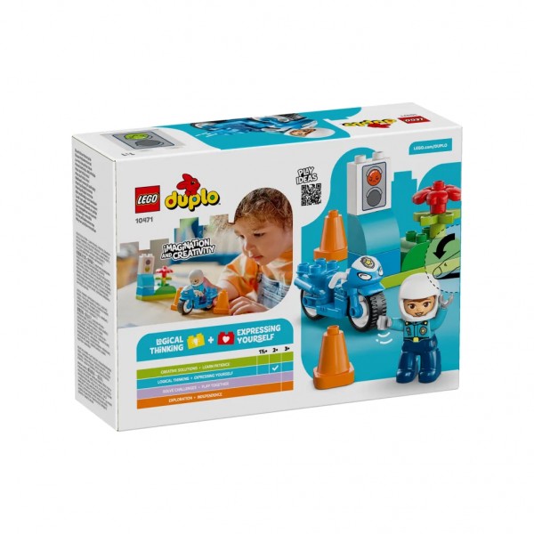 LEGO Duplo Blue Police Motorcycle. Αυτό το εκπαιδευτικό παιχνίδι δίνει στα νήπια την ευκαιρία να αναπαραστήσουν ιστορίες με τους βοηθούς της κοινότητας, καθώς η αστυνόμος ξεκινά για περιπολία στους δρόμους με την απίθανη LEGO DUPLO μοτοσικλέτα της. Αυτό το μικρό σετ για μικρά παιδιά είναι υπέροχο δώρο γενεθλίων ή κάθε περίστασης για παιδιά 2 ετών και άνω που λατρεύουν τα παιχνίδια με οχήματα έκτακτης ανάγκης, και περιλαμβάνει μια φιγούρα γυναίκας αστυνόμου, τουβλάκι-φανάρι κυκλοφορίας και 2 κώνους. Με τα μεγάλα, πολύχρωμα τουβλάκια, τις διασκεδαστικές ιστορίες και τους ποικίλους χαρακτήρες, τα LEGO DUPLO σετ έχουν σχεδιαστεί για να κεντρίζουν την εκ φύσεως περιέργεια των μικρών παιδιών και να τα βοηθούν να πετύχουν τα αναπτυξιακά τους ορόσημα. Αυτό το εκπαιδευτικό παιχνίδι τα βοηθά να εξασκήσουν τις λεπτές κινητικές τους δεξιότητες, καθώς τοποθετούν τη LEGO DUPLO αστυνόμο στην μοτοσικλέτα της και την οδηγούν γύρω από τους κώνους. Με το φανάρι κυκλοφορίας, οι γονείς μπορούν να διδάξουν τα παιδιά ότι το κόκκινο σημαίνει ότι σταματάμε και το πράσινο σημαίνει ότι ξεκινάμε.