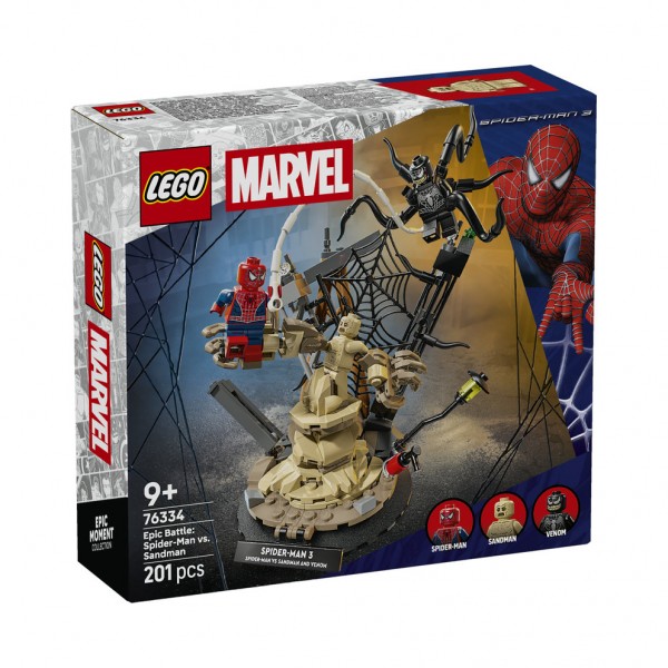 LEGO Super Heroes Epic Battle: Spider-Man vs. Sandman. Δώστε ζωή στην ταινία των Marvel Studios Spider-Man 3 με το σετ κατασκευής LEGO Super Heroes Epic Battle: Spider-Man vs. Sandman (76334) για αγόρια και κορίτσια ηλικίας 9 ετών και άνω. Διαθέτει 3 εμβληματικές μίνι φιγούρες – Spider-Man, Venom και Sandman – σε επικές περιπέτειες για παιχνίδι ρόλων και απίθανες δυνατότητες διακόσμησης. Το κατασκευάσιμο σετ συνοδεύεται από ένα κορυφαίο καστ χαρακτήρων από την ταινία και πολλά διαδραστικά στοιχεία: ο Spider-Man αιωρείται από έναν πύργο με ένα σχοινί ιστού, ο Sandman σηκώνεται από τα χαλάσματα με ένα τεράστιο χέρι και ο Venom χτυπάει με 4 κινούμενα πλοκάμια. Τα παιδιά μπορούν να διακοσμήσουν το δωμάτιό τους με το LEGO μοντέλο, με τη στιβαρή βάση και την πινακίδα ονόματος, ή να αφαιρέσουν τις μίνι φιγούρες για να αναπαραστήσουν τις δικές τους ιστορίες. Αυτό το σετ είναι εξαιρετική ιδέα δώρου γενεθλίων για νεαρούς Υπερήρωες, LEGO κατασκευαστές και φαν του Spider-Man. Και με την εφαρμογή LEGO Builder, τα παιδιά μπορούν να κατασκευάζουν με αυτοπεποίθηση – ζουμάρουν και περιστρέφουν σε 3D και παρακολουθούν την πρόοδο με απλές ψηφιακές οδηγίες.