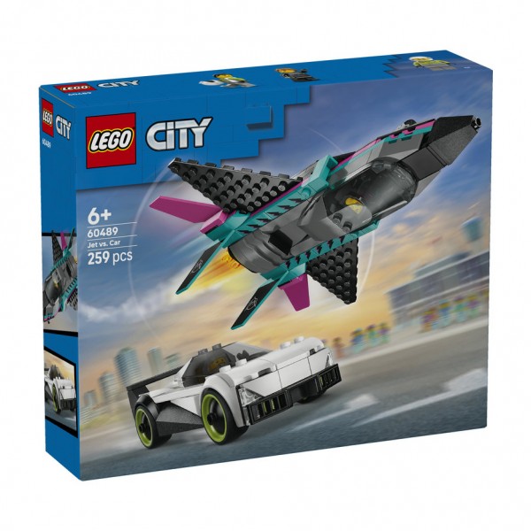 LEGO City Jet vs. Car. Αυτό το σετ παιχνιδιού περιλαμβάνει ένα αεροδυναμικό supercar και ένα υπερηχητικό τζετ για απίθανη αγωνιστική διασκέδαση. Το τζετ διαθέτει πτέρυγες με κλίση προς τα πίσω, δύο κάθετα πτερύγια και σταθεροποιητές. Τα παιδιά γυρίζουν έναν μοχλό για να ενεργοποιήσουν τους μετακαυστήρες του τζετ και να ανοίξουν το κόκπιτ του supercar για πρόσβαση στο λεπτομερές εσωτερικό του με αγωνιστικό κάθισμα. Απλώς προσθέστε τις μίνι φιγούρες του πιλότου και του οδηγού αγώνων για πολλές ώρες επικής αγωνιστικής δράσης. Κάντε την κάθε μέρα ξεχωριστή με αυτό το σετ κατασκευής τζετ και αυτοκινήτου – ένα υπέροχο δώρο για 6χρονα αγόρια και κορίτσια που αγαπούν τα παιχνίδια με αγωνιστικά αυτοκίνητα και τα μοντέλα αεροπλάνων. Προσθέστε αυτό το σετ σε άλλα (πωλούνται χωριστά) από τη σειρά LEGO® City για δράση στην πόλη. Κάντε αυτό το σετ παιχνιδιού LEGO με σπορ αυτοκίνητο και τζετ ακόμα πιο διασκεδαστικό με την εφαρμογή LEGO Builder, όπου τα παιδιά μπορούν να ζουμάρουν και να περιστρέφουν μοντέλα σε 3D και να παρακολουθούν την πρόοδο της κατασκευής τους