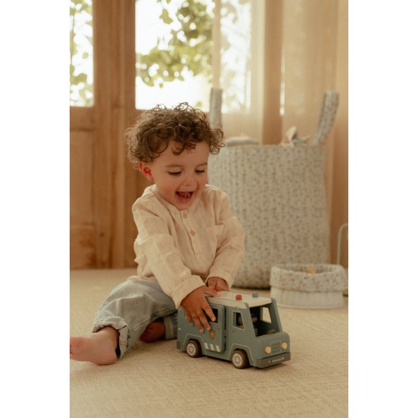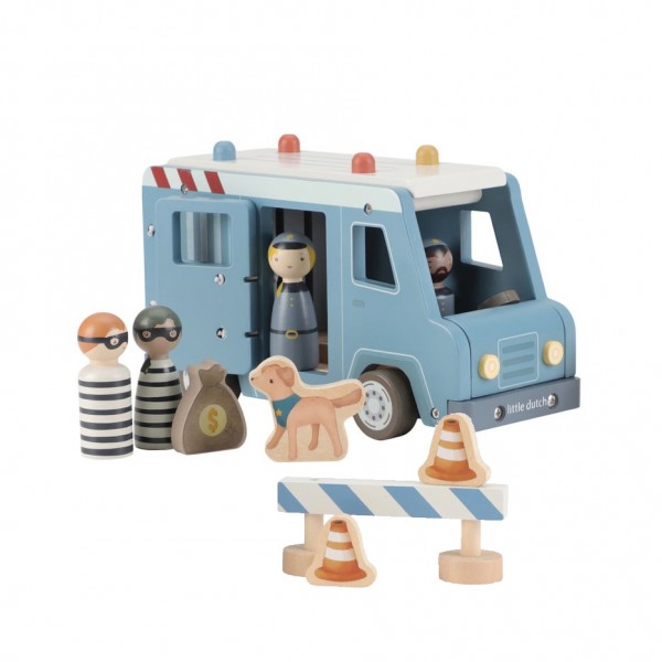 Αυτό το ξύλινο αστυνομικό βαν περιλαμβάνει τέσσερις φιγούρες (δύο αστυνομικούς και δύο κλέφτες), έναν σκύλο της αστυνομίας, μια τσάντα με χρήματα, κώνους και οδόφραγμα.
