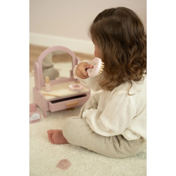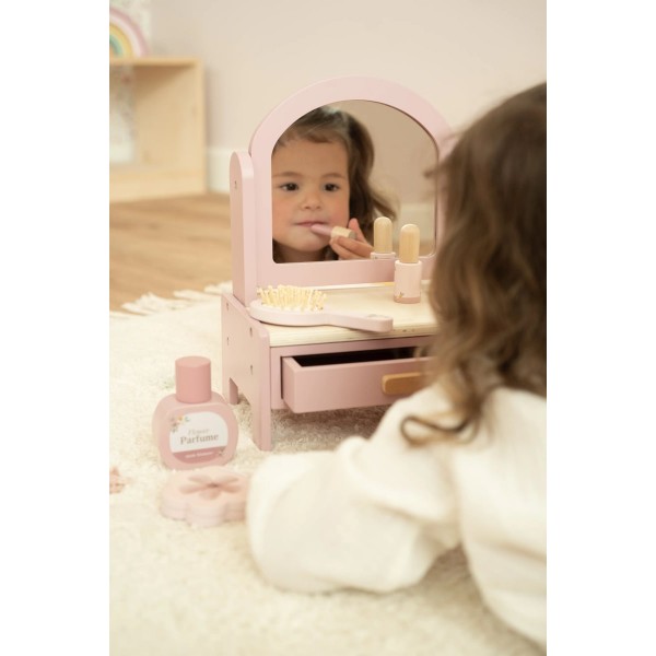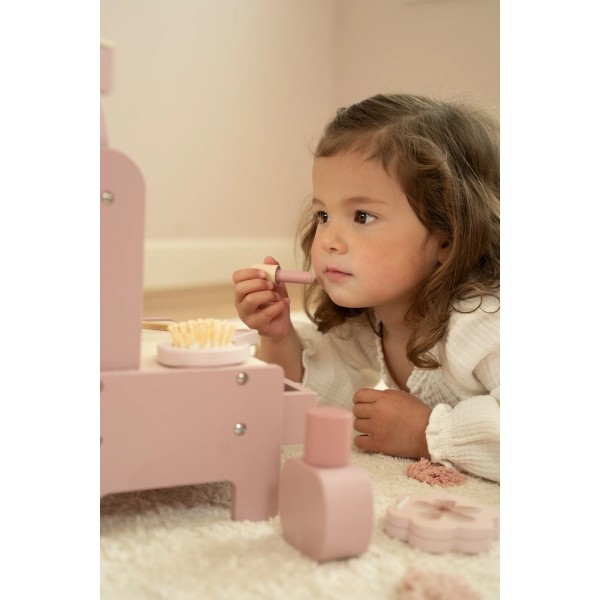 Αυτό το υπέροχο ξύλινο boudoir διαθέτει περιστρεφόμενο καθρέφτη και περιλαμβάνει έξι χαριτωμένα αξεσουάρ ομορφιάς, όπως βούρτσα μαλλιών, κραγιόν και άρωμα.