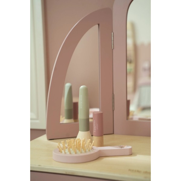 Το σετ περιλαμβάνει έξι ξύλινα καλλυντικά και ένα χαριτωμένο σκαμπό με λουλουδάτο σχέδιο.