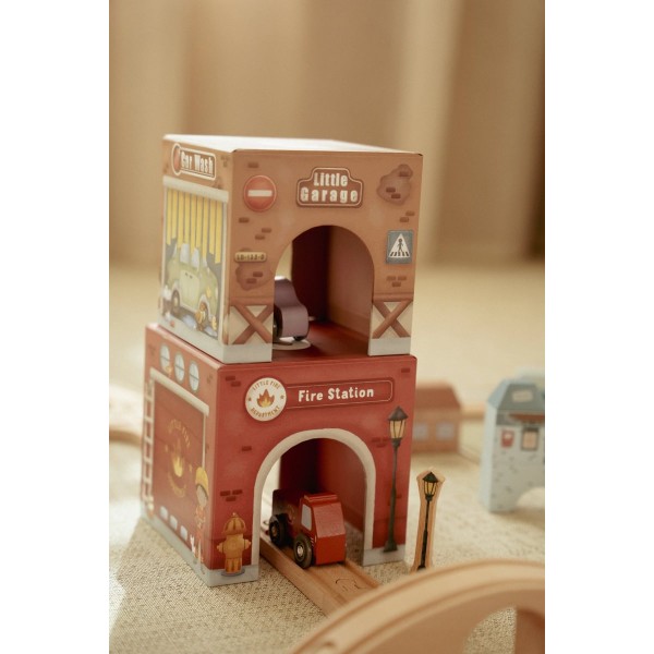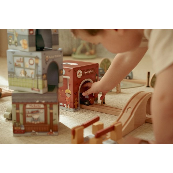 Αυτό το χαρούμενο σετ περιλαμβάνει 6 εικονογραφημένους χάρτινους κύβους και αντίστοιχα οχήματα, προσφέροντας αμέτρητες δυνατότητες παιχνιδιού και φαντασίας. Οι κύβοι μπορούν να στοιβαχτούν ο ένας πάνω στον άλλο ή να τοποθετηθούν πάνω στις ράγες του τρένου, επιτρέποντας στα οχήματα να περνούν από κάτω με ευκολία.