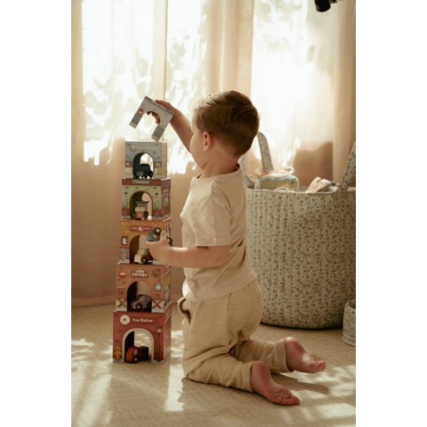 - Περιλαμβάνει 6 κύβους από ανθεκτικό χαρτόνι με πιστοποίηση FSC και ξύλινα αυτοκινητάκια.