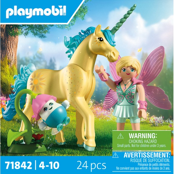 Γνώρισε τον μονόκερο «Λουλούδι του ήλιου» και τη μαγευτική νεραϊδοφίλη! Οι νεράιδες λατρεύουν το «Λουλούδι του ήλιου», επειδή με την ηλιόλουστη φύση του φωτίζει κάθε μέρα. Με την ακλόνητη αισιοδοξία του βοηθάει στην αντιμετώπιση ακόμη και πολύ δύσκολων εργασιών με απλότητα. Η μαγευτική νεράιδα υποστηρίζεται από τον χαριτωμένο συνοδό της, τον Joyling, που βοηθάει με πολλή χαρά και αφοσίωση στη φροντίδα του μονόκερου. Μπορείς να αλλάζεις τη χαίτη, την ουρά και το κέρατο του μονόκερου. Έτσι μπορείς να δημιουργείς - με άλλους μονόκερους της νέας σειράς μονόκερων PLAYMOBIL - ξεχωριστούς και μοναδικούς μονόκερους!