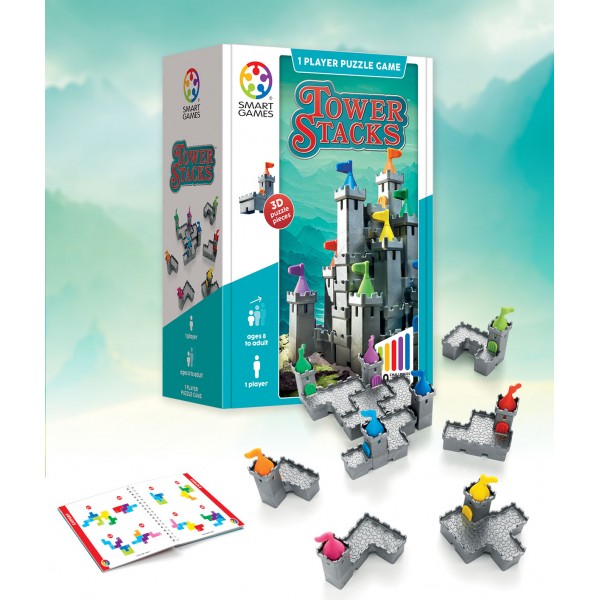 Χτίστε το κάστρο σας από την αρχή! Το Tower Stacks της εταιρείας Smart Games προκαλεί τους παίκτες να χτίσουν ένα κάθετο κάστρο χρησιμοποιώντας 9 κομμάτια παζλ. Ξεκινήστε από το πάτωμα και χρησιμοποιήστε δεξιότητες σχεδιασμού για να στοιβάξετε τα κομμάτια και να λύσετε τις 80 προκλήσεις που περιλαμβάνονται, από εύκολο έως πιο προχωρημένο επίπεδο. Ένα κλασικό παιχνίδι προκλήσεων μυαλού, για βασιλιάδες και βασίλισσες, μικρούς και μεγάλους!