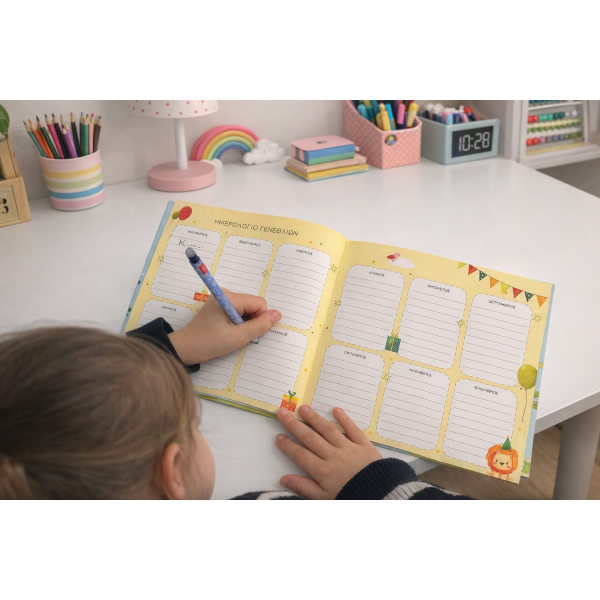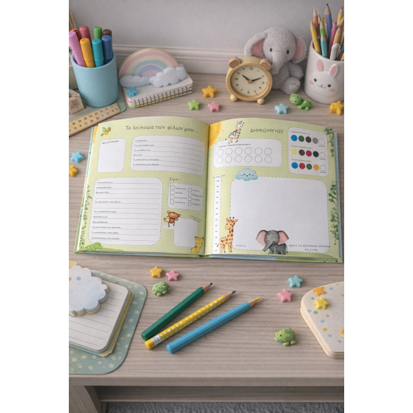Κάθε παιδί έχει τον δικό του χώρο να γράψει λίγα λόγια για τον εαυτό του, να απαντήσει σε μικρές, χαρούμενες ερωτήσεις, να ζωγραφίσει, να αφήσει το δικό του αποτύπωμα.