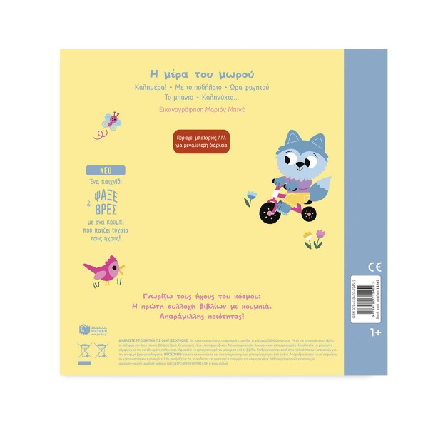 Και στο τέλος, ένα παιχνίδι αναζήτησης και εύρεσης ήχου με ένα κουμπί-έκληξη! Το παιδί πατάει το κουμπί και δείχνει την εικόνα που ακούει. Πατάει ξανά και ψάχνει σε ποια εικόνα αντιστοιχεί ο νέος ήχος και αυτό, όσες φορές θέλει!