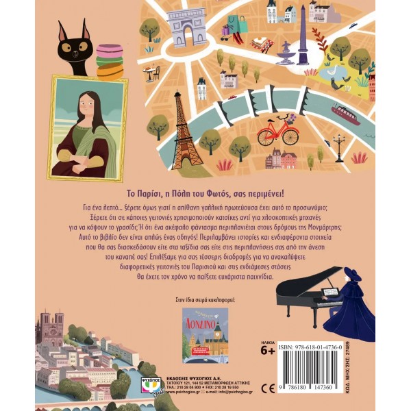 Το Παρίσι, η Πόλη του Φωτός, σας περιμένει! Για ένα λεπτό… ξέρετε όμως γιατί η απίθανη γαλλική πρωτεύουσα έχει αυτό το προσωνύμιο; Ξέρετε ότι σε κάποιες γειτονιές χρησιμοποιούν κατσίκες αντί για χλοοκοπτικές μηχανές για να κόψουν το γρασίδι; Ή ότι ένα ακέφαλο φάντασμα περιπλανιέται στους δρόμους της Μονμάρτρης; Αυτό το βιβλίο δεν είναι απλώς ένας οδηγός! Περιλαμβάνει ιστορίες και ενδιαφέροντα στοιχεία που θα σας διασκεδάσουν είτε στα ταξίδια σας είτε στις περιπλανήσεις σας από την άνεση του καναπέ σας! Επιλέξαμε για σας τέσσερις διαδρομές για να ανακαλύψετε διαφορετικές γειτονιές του Παρισιού και στις ενδιάμεσες στάσεις θα έχετε τον χρόνο να παίξετε ευχάριστα παιχνίδια.